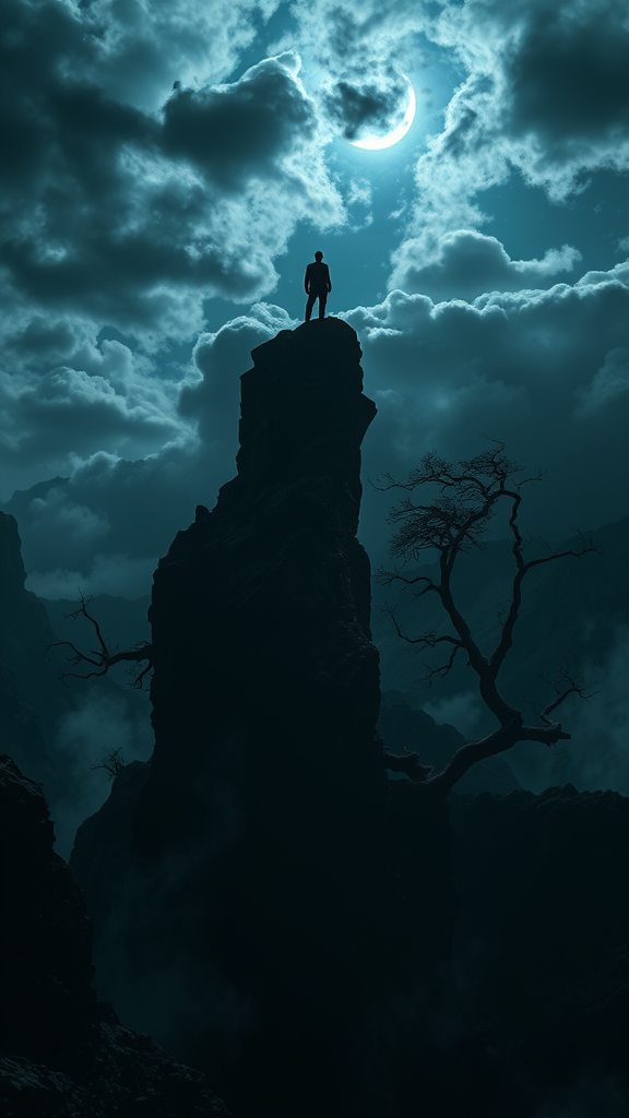 A solitary figure stands atop a craggy cliff, silhouetted against a tumultuous, cloud-laden sky. Under the ghostly glow of a crescent moon breaking through, the scene is bathed in an ethereal light. Below, a foreboding valley sprawls, its depths lost to shadow. Twisted trees claw upward like spectral fingers, jagged rocks and hidden ravines creating an intricate web of darkness. Mist swirls ghost-like through the valley, adding a layer of enigma to the already tense atmosphere. The landscape is shrouded in a moody, cinematic ambiance, creating a palpable sense of mystery and intrigue, set in a 16:9 aspect ratio.