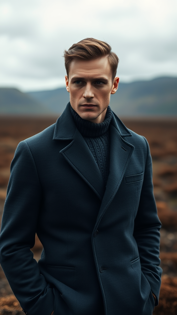 A solitary figure stands in a vast Scottish landscape, dressed impeccably in the style of Daria Endresen and Kris Knight, his attire blending seamlessly with the surroundings in hues of light navy and dark brown. The scene exudes the sleek elegance of Georg Jensen design, capturing the essence of intense close-ups with a matte finish. His expression is contemplative, the camera focusing on the subtle details of his face, set against a backdrop that echoes the moody beauty of a Scottish moor. The interplay of light and shadow enhances the texture of his clothing and the rugged beauty of the land, creating a captivating and atmospheric portrait that intrigues and invites viewers into its narrative.