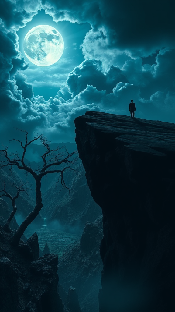 A solitary figure stands on a rugged cliff, their silhouette stark against the tumultuous sky, where storm clouds churn around a brilliant full moon, casting an ethereal glow. Below, a foreboding valley sprawls, swathed in shadow and intrigue. Twisted trees reach like gnarled fingers toward the heavens, while jagged rocks and deep ravines create a labyrinthine landscape. The atmosphere crackles with tension and mystery, the scene bathed in a cool, spectral light, accentuating every contour and crevice. In the distance, faint whispers of mist weave through the darkness, adding an element of the unknown to this enigmatic vista.