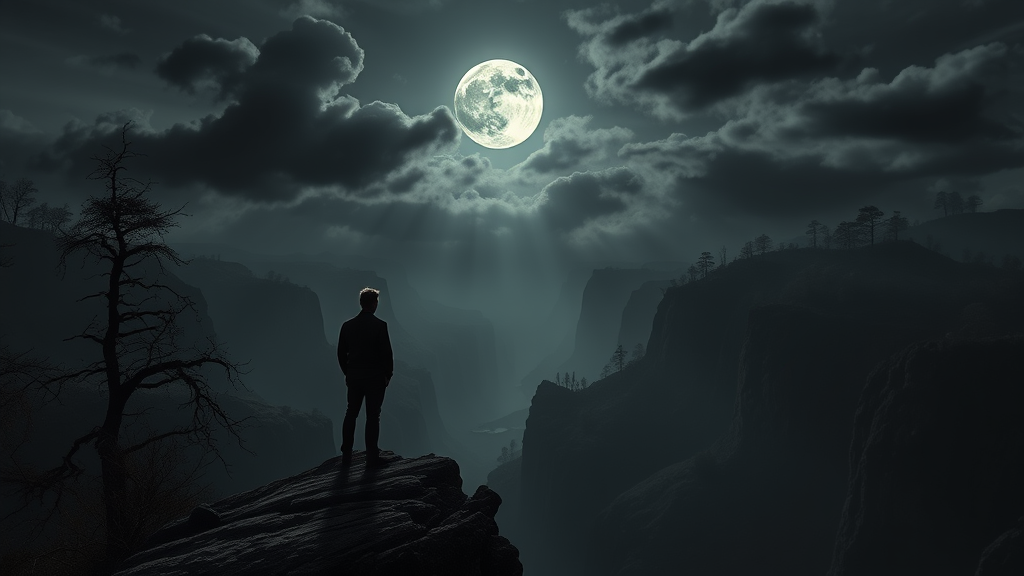 A solitary figure stands on a rugged precipice, gazing out over an enigmatic and cinematic expanse, where a dark, menacing gorge stretches below. Silhouetted against a turbulent, cloud-filled sky, the figure is bathed in the ethereal glow of a full moon, casting an unsettling pallor over the landscape. The valley is cloaked in shadow, with glimpses of gnarled trees, sharp boulders, and yawning chasms emerging from the murk. The scene conveys a brooding, atmospheric tension, with an 8k resolution fine-tuning the interplay of light and shadow, offering an immersive and haunting portrayal of this mysterious world.