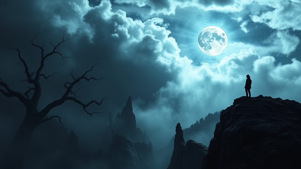 A solitary figure stands on the edge of a rugged cliff, overlooking a foreboding and mist-laden valley. The silhouette is sharply defined against a tumultuous sky, illuminated by the spectral light of a full moon peeking through swirling clouds. The landscape below appears treacherous, with twisted trees reaching out like skeletal hands, jagged rocks casting elongated shadows, and deep, shadowy chasms weaving through the terrain. The composition resonates with a sense of mystery and impending drama, enveloped in a dark and brooding atmosphere, adding a layer of tension and intrigue to the scene.