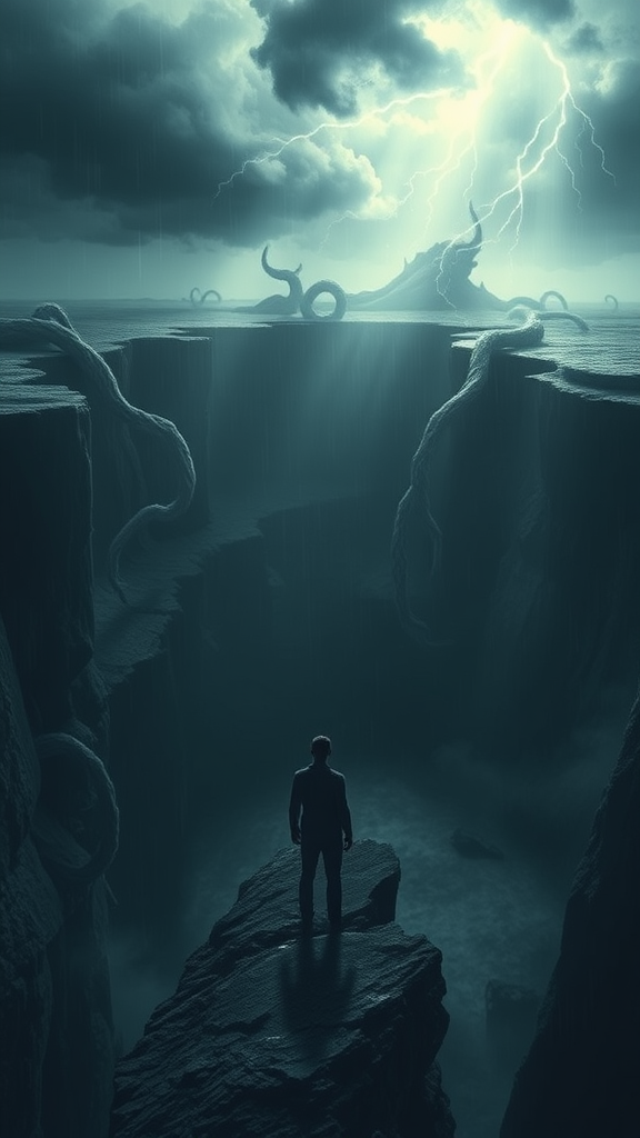 A solitary figure stands on the edge of a vast, dark chasm, their expression one of awe and determination as they stare into the swirling void. Shadowy tendrils reach out from the depths, hinting at ancient mysteries and hidden power. A tumultuous storm brews overhead, casting flashes of eerie light that dance across their resolute form, blending the lines between fear and fascination. The scene is a blend of dark fantasy and introspective exploration, capturing the delicate balance between confronting inner demons and embracing the unknown.
