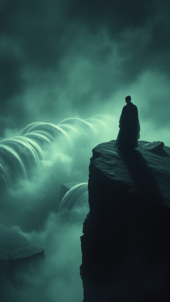 A solitary figure stands on the precipice, enveloped in a shroud of mist and shadow. Their eyes reflect an ethereal luminescence as they peer into the infinite void below, where swirling tendrils of darkness coil and dance in a mesmerizing ballet. The air vibrates with an otherworldly hum, resonating with the mysteries of the abyss. Fragments of ancient ruins surround the edge, whispering forgotten stories of lost civilizations. Ghostly echoes hang in the air, suspended in a realm where time and space converge and the unknown beckons with an irresistible allure.