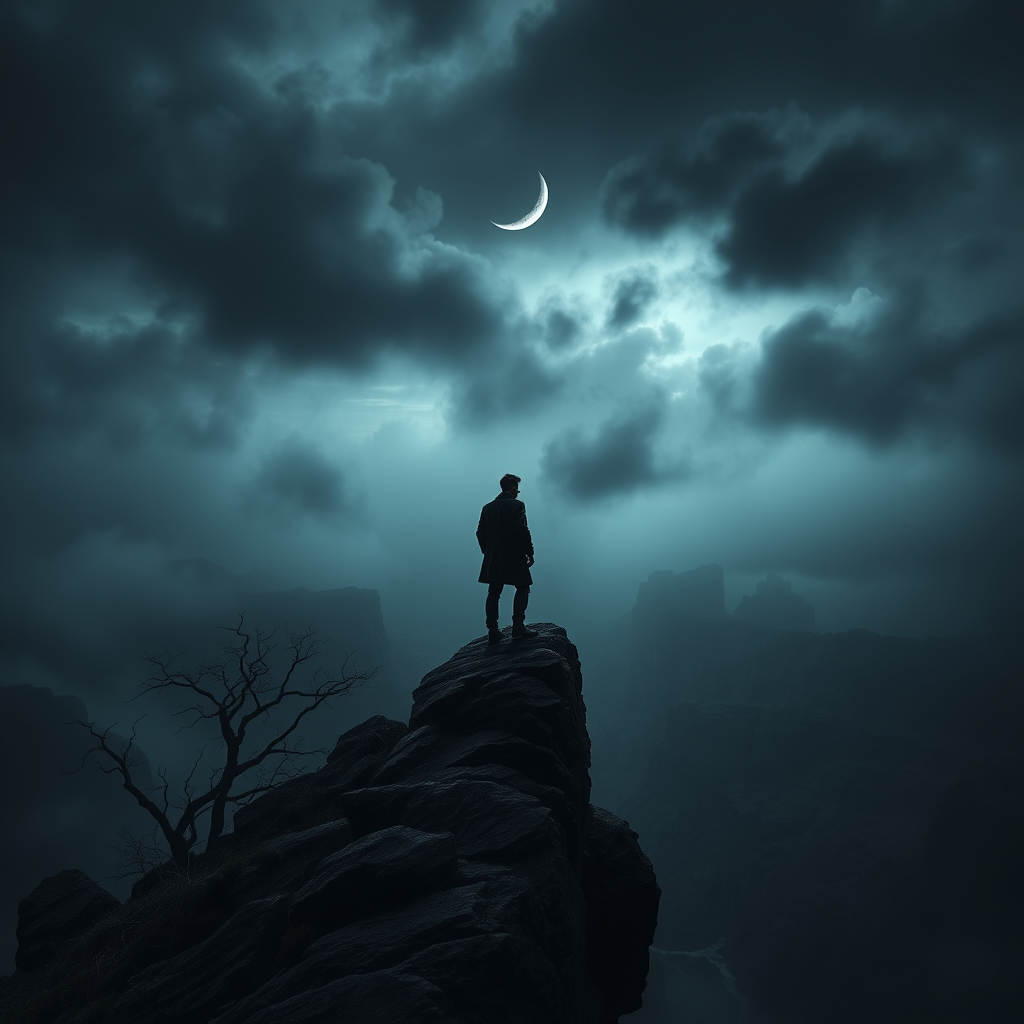 A solitary figure stands perched on a rugged cliff, peering into the vast, enigmatic valley below. The scene is enveloped in a thick, cinematic mist, with clouds swirling ominously above. Silhouetted against the stormy sky, the figure is bathed in an eerie glow from a crescent moon that hangs hauntingly overhead. The valley sprawls into shadow, revealing glimpses of gnarled trees, jagged stone formations, and treacherous ravines that cut through the land. The overall atmosphere is dark and foreboding, with a palpable sense of mystery and tension that hangs heavily in the air.