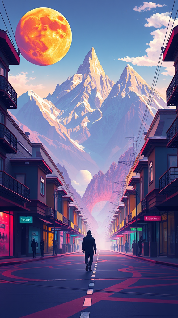 A solitary figure strolls down a vibrant street, majestic mountains towering in the background, inspired by the intricate style of Beeple. The scene is a stunning digital art piece, featuring an exquisite, detailed illustration. An orange planet hovers above, accompanied by a colossal moon that illuminates the scene. This mesmerizing landscape is rendered in super detailed, low poly art, with a kaleidoscope of colors captivating the viewer's gaze. Dark silhouettes of futuristic buildings line the street, adding a sense of wonder and mystery to the ethereal environment.