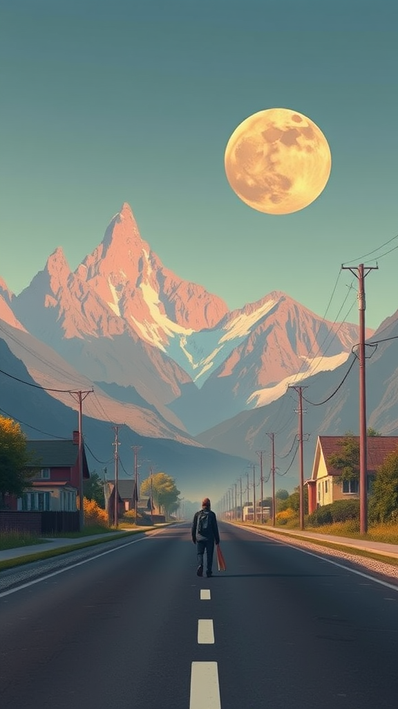 A solitary figure walks down a tranquil street, majestic mountains rising in the background. Drawing inspiration from Beeple, the scene is a digital masterpiece characterized by a beautiful, detailed illustration of an orange planet and a giant moon looming in the sky. The artwork employs a super detailed, low-poly style with vibrant colors, reminiscent of classic low-res charm. Textures are intentionally imperfect, suggesting jpeg artifacts, and a hidden signature subtly marks the art. The figure's anatomy is whimsically distorted, with extra limbs and unusual digits emerging in a surreal, dreamlike display. Among the otherworldly details, the piece embodies tiling errors and slight distortions that create an intriguing, uncanny atmosphere. Despite these artistic quirks, the scene captures a unique blend of beauty and the bizarre, evoking a sense of mystery within its captivating, imperfect landscape.
