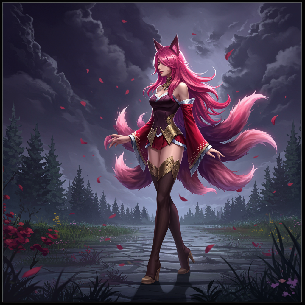 A solitary figure wanders, lost deep in thought, embodying Ahri as she seeks solace and discovers inner peace. The scene is centered, featuring a stunning visual with intricate and highly detailed elements that capture breathtaking beauty. The precise lineart is complemented by vibrant colors, creating a comprehensive cinematic experience. Inspired by the styles of Anna Dittman and Carne Griffiths, the image showcases Ahri in a dynamic full-body pose with beautiful lighting. Despite the low resolution, the focus is clean and the composition avoids any text, errors, or cropping issues. This visual masterpiece avoids any negative elements such as duplication, distortion, or poor quality, ensuring a flawless representation without any watermarks or signatures.