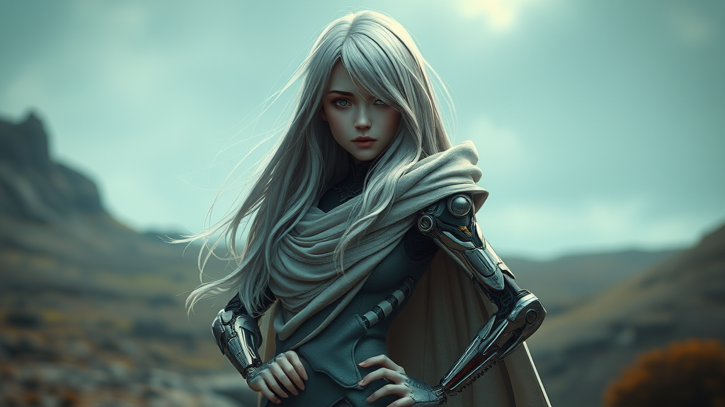 A solitary girl, embodying an android essence, stands in a futuristic landscape with intricate mechanical arms and sleek prosthetic features. Her hair, a lustrous silver cascade, flows down her back, partially concealed by a mysterious cloak that billows gently. As she gazes directly at the viewer, her pose is confident and assured, with one hand resting on her hip. The scene captures the seamless blend of human curves and robotic design, exuding an aura of strength and enigma.