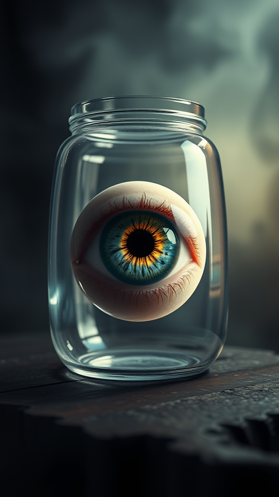 A solitary human eye encapsulated in a sleek glass jar, its surface reflecting intricate details as if crafted by the visionary styles of Peter Mohrbacher and Greg Rutkowski. The eye, an amalgam of vivid colors, is bathed in an ethereal light, creating a surreal glow. Rendered in stunning 8k ultra-high-definition with photorealistic precision, the scene captures the delicate balance between realism and fantasy, akin to a Redshift render. The background is an enigmatic blend of shadow and light, enhancing the eye's intense, captivating gaze. This visual masterpiece conjures an atmosphere of mystery and wonder, inviting observers to explore its depths.