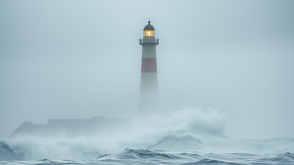A solitary lighthouse stands resilient against the crashing waves, its warm glow cutting through the thick fog as it guides weary sailors safely back to shore.