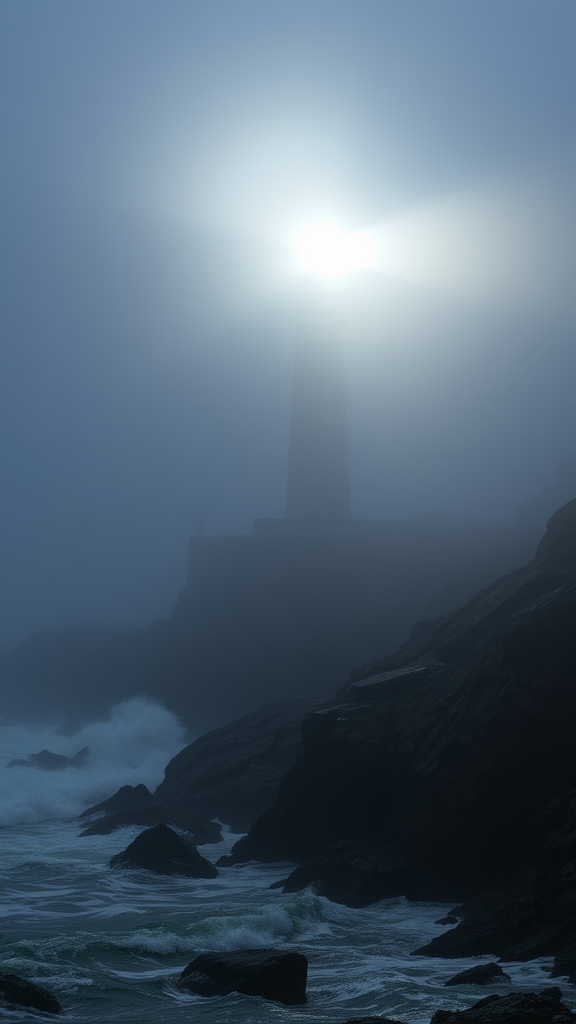 A solitary lighthouse stands steadfast on a rugged coastline, its beam cutting through the thick fog as waves crash against the jagged rocks below, guiding lost ships safely back to shore during the stormy night.
