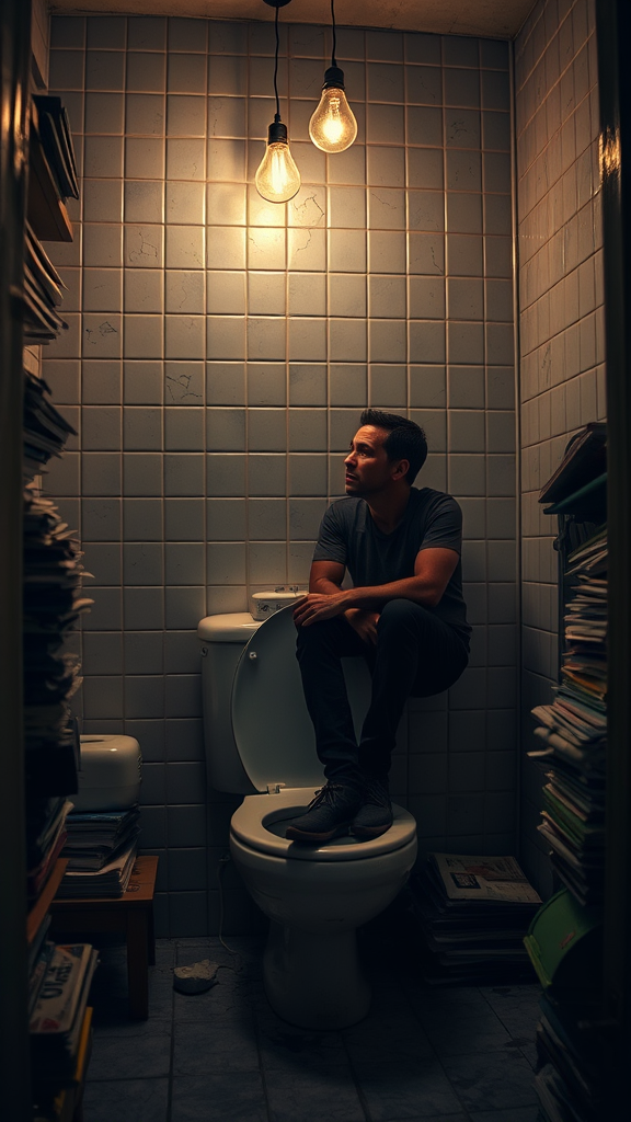 A solitary man perched on a weathered toilet in a dimly lit, cluttered bathroom, surrounded by stacks of old magazines and the faint smell of lavender air freshener, gazes thoughtfully at the cracked tile wall, lost in introspection as a single flickering bulb casts dancing shadows around him.