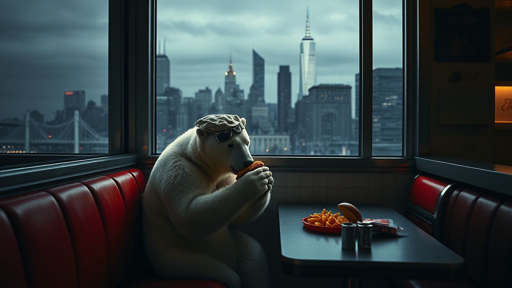 A solitary polar bear, wearing a tattered baseball cap, sits quietly by the window in a dimly-lit, deserted cafe diner in New York, feasting on a hamburger and fries. The city's iconic skyline looms silently outside, casting long shadows into the room. Captured in the vivid, cinematic style reminiscent of Miles Aldridge, the scene is an evocative blend of melancholy and whimsy, the bear's fur contrasting starkly with the retro 1950s decor, crimson seat cushions, and checkered floor.