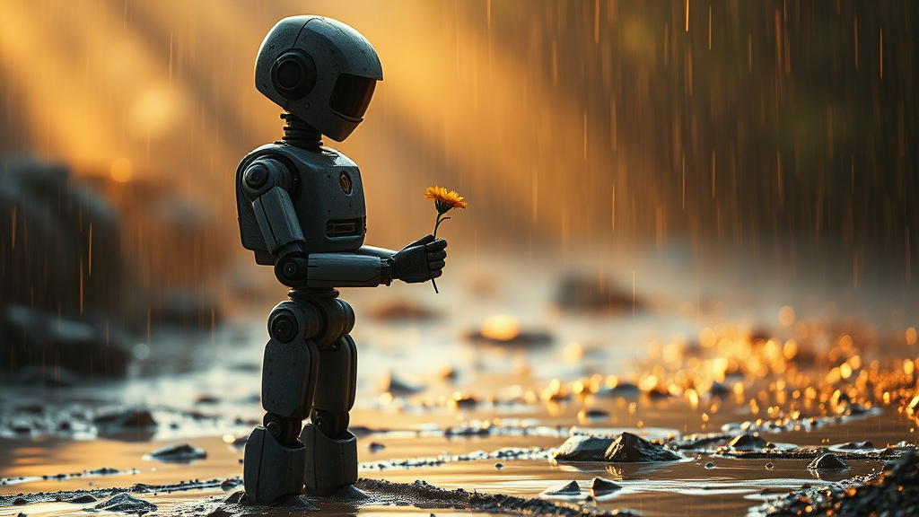 A solitary robot with a weathered exterior stands amidst a rain-soaked landscape, gently holding a delicate flower in its mechanical grasp. Cinematic lighting casts soft, golden beams through the humid air, creating an ethereal ambiance. Volumetric rays highlight the contrasting scene, as droplets of water cling to the robot, reflecting the faint glimmers of light. The ground is a tapestry of wet, dripping mud, each droplet reverberating as it meets the earth. Melancholic yet hopeful, the scene captures a poignant moment of quiet beauty.