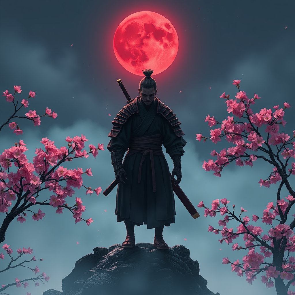 A solitary ronin stands atop a misty Japanese mountain, surrounded by delicate cherry blossoms swaying in the breeze. His mind is a storm of emotions, depression and anger reflected in his tense posture. Above, the moon casts an eerie red glow, like a slash of blood across the night sky, illuminating his solemn expression. The landscape around him is both serene and haunting, blending the beauty of nature with the weight of his turmoil.