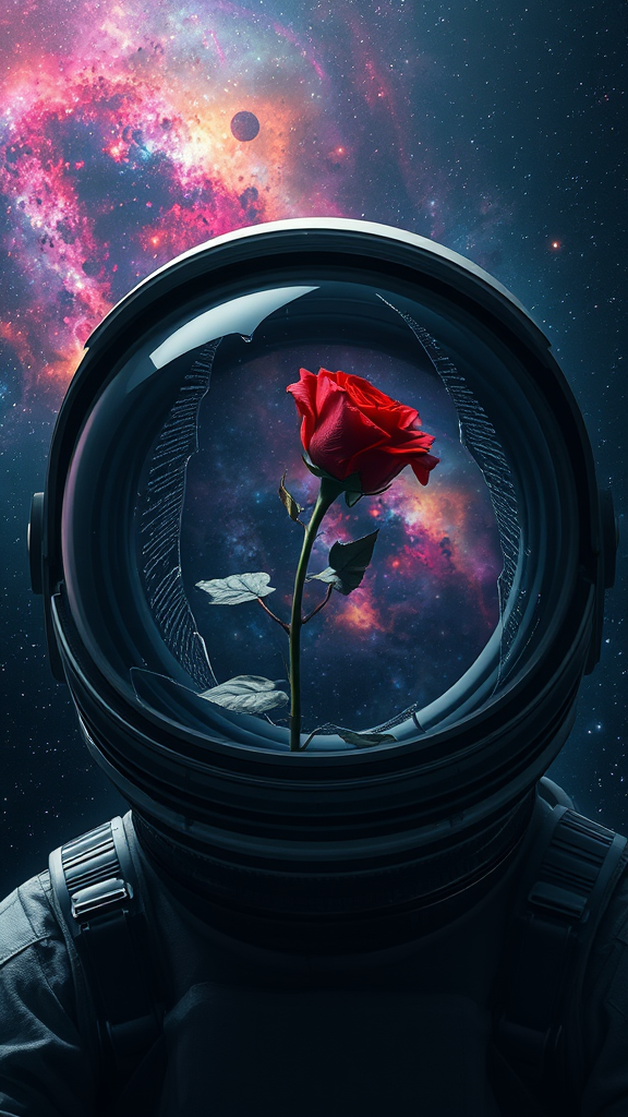 A solitary rose gracefully blooms from the fractured visor of an astronaut's helmet, floating amidst the vastness of open space. Around it, an expansive galaxy swirls with the brilliant hues of a distant nebula, each detail rendered with photorealistic precision. The scene, captured in hyper detail, is illuminated by ethereal volumetric lighting, casting gentle shadows and highlights that enhance the vibrant reds of the rose against the dark void. The 8k octane render captures every nuance, with HDR enhancing the depth and contrast. The vertical orientation of the scene further emphasizes the infinite backdrop, drawing the eye upwards through the cosmos.