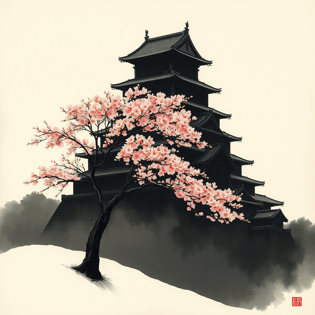 A solitary sakura tree blooms atop a gentle hill, its delicate petals contrasting against the backdrop of a majestic Japanese castle painted in hues of black and dark crimson. The composition evokes the elegance of a traditional scroll painting, rendered in the minimalist sumi-e style with subtle influences of Luis Royo. The scene is peaceful and haunting, devoid of any human presence, emphasizing the serene interplay between nature and ancient architecture. The vertical expanse invites viewers to explore the silent narrative where tradition meets tranquility.