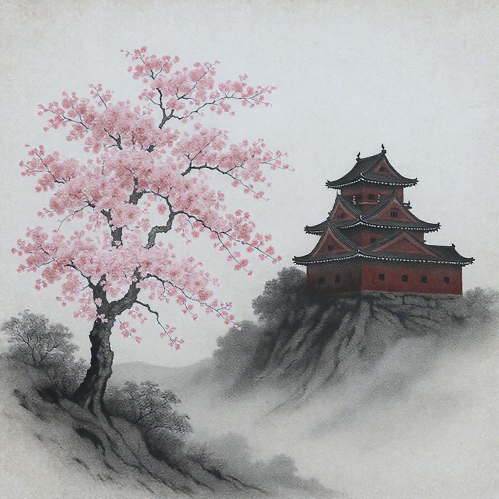 A solitary sakura tree blossoms on a tranquil hillside, framing the distant silhouette of a majestic Japanese castle adorned in contrasting black and deep red hues. The scene is captured in the elegant simplicity of a scroll painting, reminiscent of a sumi-e drawing, exuding a minimalist aesthetic. The artwork is devoid of human presence, emphasizing the serene connection between nature and ancient architecture.