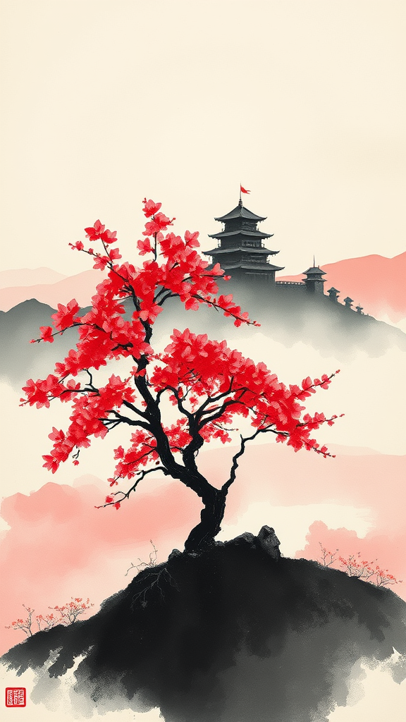 A solitary sakura tree perched on a serene hill, a distant Japanese castle silhouetted in deep black and crimson hues, reminiscent of ancient scroll paintings; the delicate strokes of sumi-e capture the scene in minimalist beauty, evoking a Luis Royo's ethereal style, devoid of human presence.