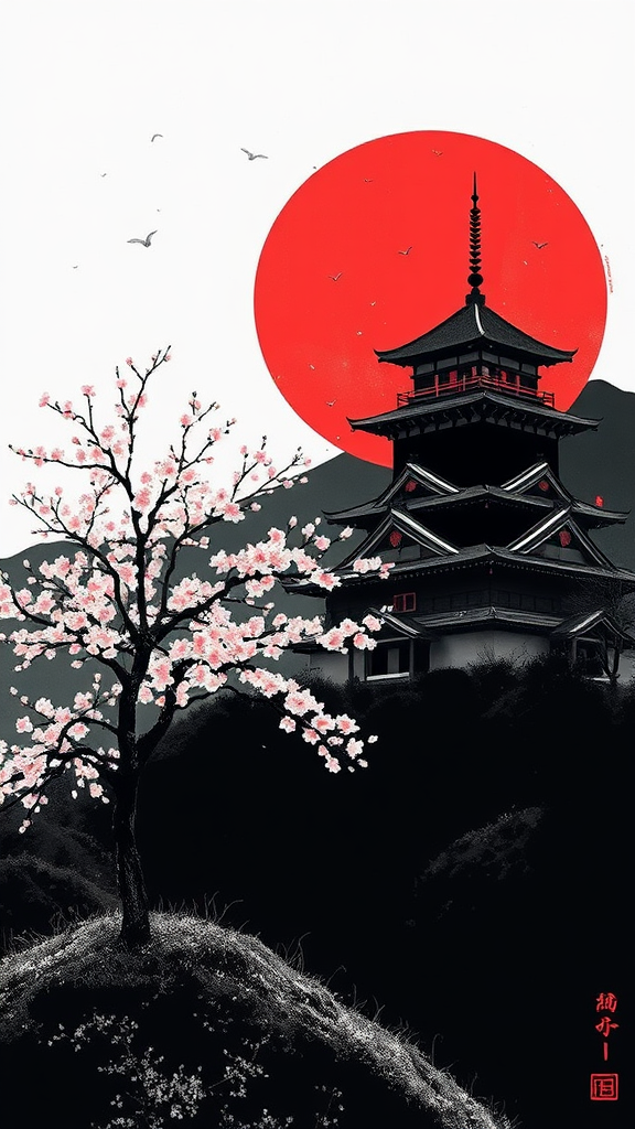 A solitary sakura tree stands gracefully on a hill, its delicate blossoms contrasted against the backdrop of a majestic Japanese castle rendered in bold black and crimson hues. The scene captures the essence of a traditional scroll painting, evoking the minimalist elegance of a sumi-e drawing. In this serene landscape, the absence of human presence emphasizes the harmonious interplay between nature and architecture, inviting a sense of solitude and reflection.
