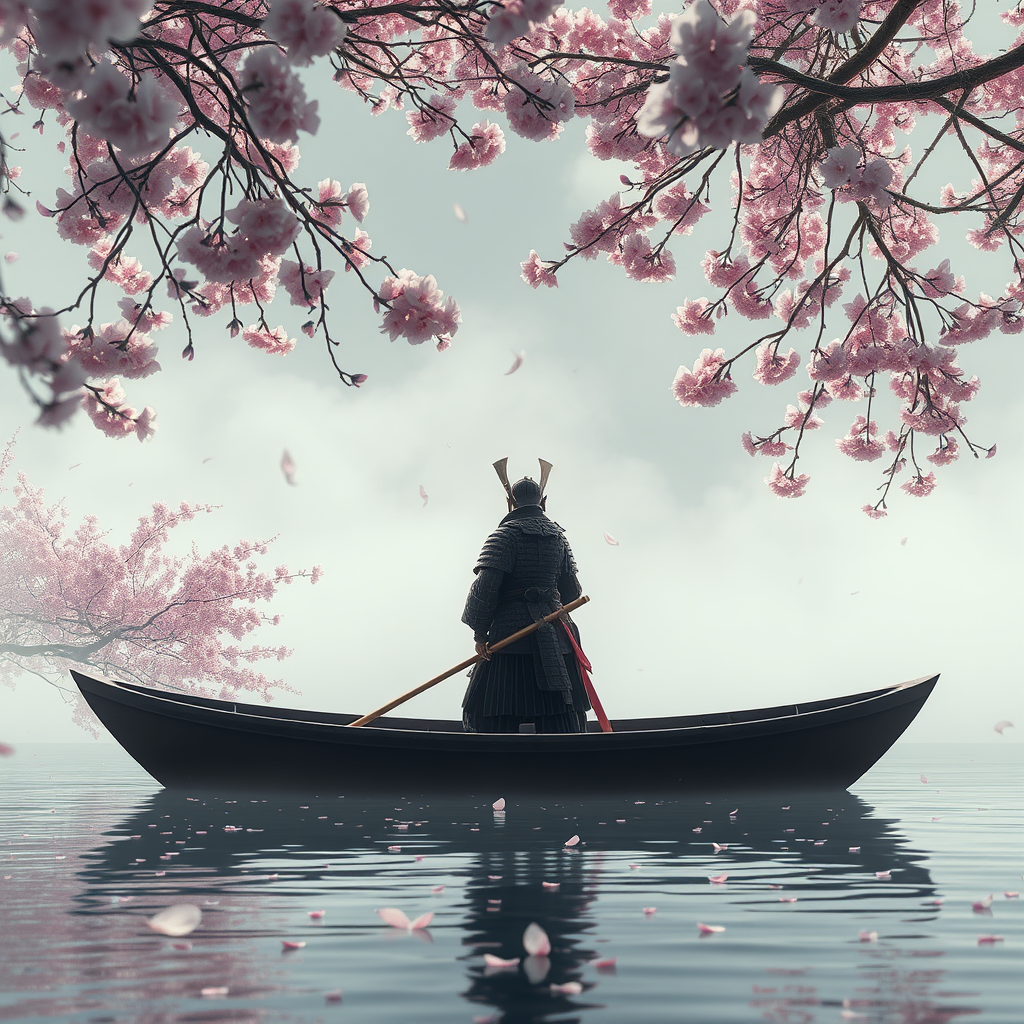 A solitary samurai stands poised in a graceful boat surrounded by a sea of cherry blossoms, the scene reminiscent of lush, fairycore landscapes. The atmosphere is imbued with intricate details and beautiful artistry, as if crafted by the skilled hands of Greg Rutkowski and Magali Villeneuve. A gentle, fog-laden background enhances the epic realism, lending an air of mystery to the scene. The lighting is a harmonious blend of dramatic and ambient, bathing the scene in a soft yet striking glow. Rim light catches on the samurai's armor, highlighting the muted colors of the setting. Hyperdetailed elements draw the eye to the cinematic tableau, where each petal and ripple in the water tells a story of beauty and tranquility amidst stillness.