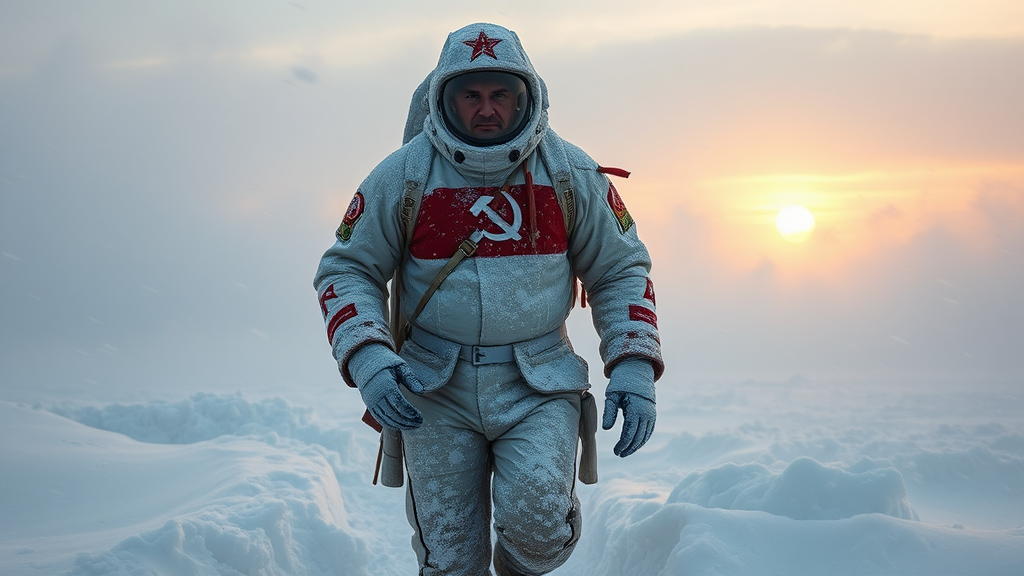 A solitary Soviet Arctic explorer trudges through a ferocious blizzard as the setting sun struggles to break through the swirling tempest. Wrapped in a bulky, worn retro-futuristic spacesuit marked with faded red and white, a bold CCCP insignia stretches across his chest. Frost and ice encase the suit, battered by the relentless Arctic fury, snow stubbornly adhering to its edges and joints. The blizzard rages on, snow and ice shards violently swirling, shrouding the landscape and turning the explorer's journey into a harrowing ordeal. The air is thick with driving snow, mingling with the weak light from the descending sun, casting dim, golden rays that strive to slice through the storm. These beams form fleeting, ghostly shafts through the blizzard, catching on the swirling snowflakes and briefly illuminating the scene in haunting bursts. Despite the fading light and brutal conditions, the explorer forges onward to a barely discernible nuclear generator, half-buried in the drifts. Each step is labored and sluggish, with snow increasing around his legs as he battles the fierce winds. The weathered spacesuit reveals signs of extensive wear, with cracks in the visor fogging over, visible breath inside the helmet. Snow particles lash violently around him, catching the day's last light, while momentary bursts of golden sunlight filter through the blizzard, casting a surreal glow over the hostile, frozen expanse. As the sun sets, it stretches long, dramatic shadows across the snow-laden ground, but the storm's fury constantly threatens to extinguish this light, rendering the environment immense and unforgiving. The blizzard is merciless, snow and ice clinging to the explorer’s suit, the descending sun instilling a sense of urgency, as if time is slipping away. The last sunlight flickers among the airborne snow, creating a dynamic spectacle, with light perpetually shifting and fading as the explorer persists onward.