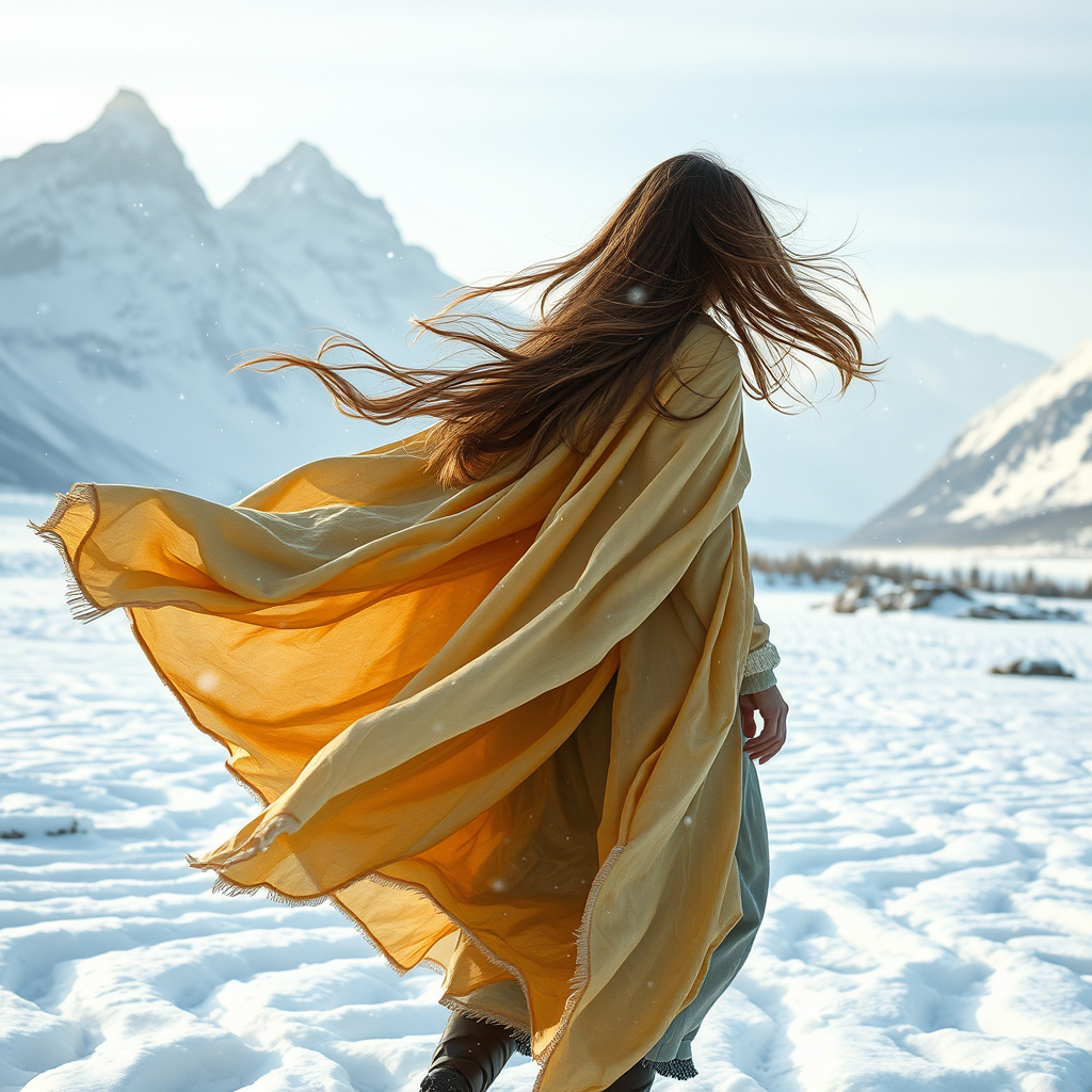 A solitary woman with flowing, long hair wanders through a frostbitten landscape, snowflakes swirling gently around her in an intricate dance. The scene is reminiscent of a cinematic montage, infused with the imaginative essence of dragon art. Her cloak, billowing in the wind, is tinged with shades of yellow and white, evoking the stylistic nuance of Franciszek Starowieyski and the hyper-realistic detail of John Howe. Majestic mountain peaks rise in the distance, their grandeur reminiscent of Himalayan art, while the intricate patterns of snow underfoot seem almost alive, capturing a moment where myth and reality intertwine seamlessly.