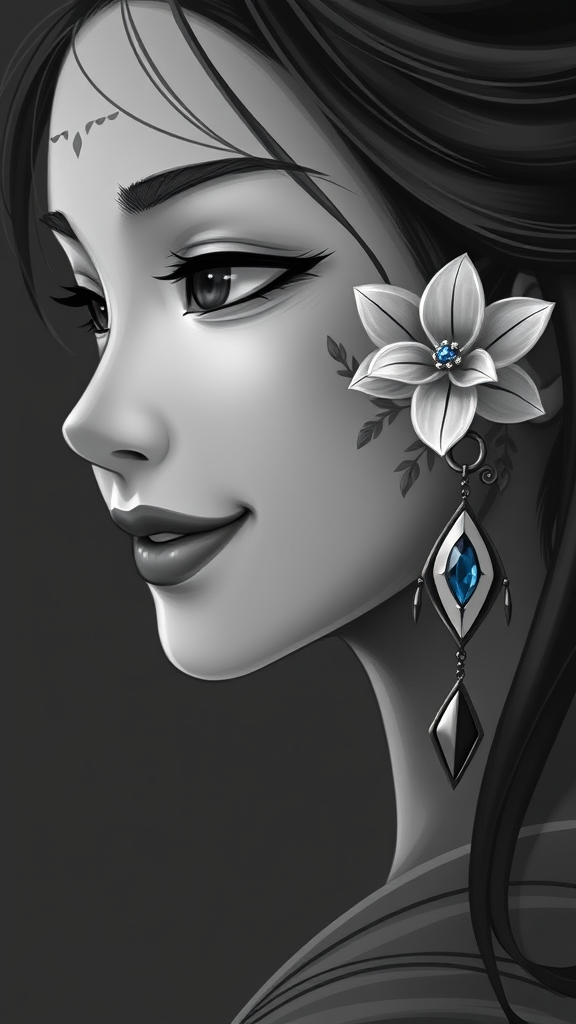 A solo female character with parted lips, a light smile, and an inquiring gaze to the side, set against a dark grey background. Her face is adorned with a subtle facial mark, reminiscent of ancient decorative traditions seen in Dota 2-inspired aesthetics. Her eyes are cast downwards with a hint of curiosity, framed by a delicate flower tucked behind her earβa stark against the somber monochromatic palette. Earrings that resemble intricately crafted willow leaf designs from Dark Willow's art drawer drip with enigmatic elegance. The character's nose and teeth are underscored by the gem in the flower, creating a visual axis through the portrait, anchored at the spot color of her watchful, part-shy grin. Meanwhile, the beauty of monochrome is aptly demonstrated in the refined details of this female figure, balanced in the middle of the unfaltering greyscale design.