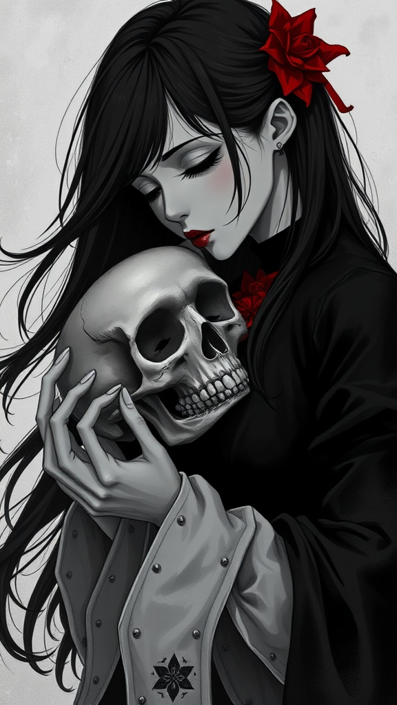 A somber image of a woman tenderly kissing a skull, the scene infused with Andreas Rocha's artistic influence and elements of Japanese-inspired art. Gothic undertones are prevalent, blending a strong sense of realism with anime-inspired character designs. The woman's flowing hair contrasts with the stark simplicity of her black and white attire. The palette is dominated by shades of gray and vibrant crimson accents, enhancing the moody atmosphere. Her expression is serene, yet deeply introspective, set against a soft, shadowy background that echoes classic black and white portraits, combining the ethereal with the corporeal.