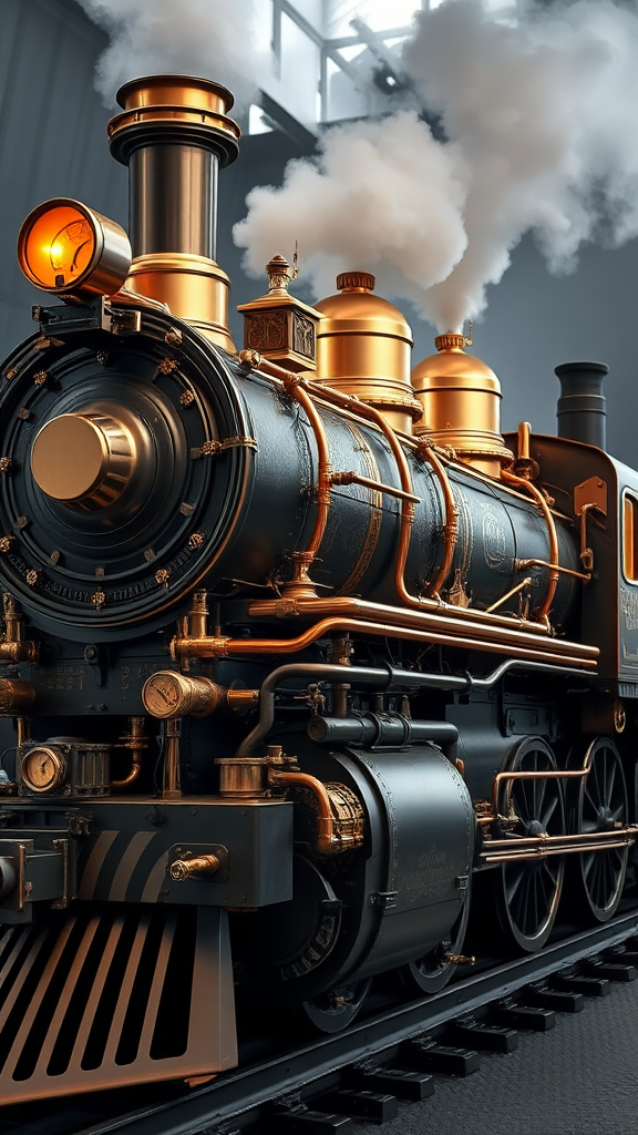 A sophisticated and intricately designed steam locomotive, featuring a maze of polished brass gears and valves, with a network of copper pipes weaving through its chassis. The engine's body is adorned with ornate engravings, shimmering under the light as plumes of steam emerge gracefully from its chimney stack, merging with the rhythmic churning of its powerful pistons. Its massive iron wheels, precision-crafted and etched with filigree, turn in perfect harmony, while the cabin glows warmly, housing a complex array of gauges and levers, each with its own unique function in maintaining the beast's elegant yet formidable presence on the iron tracks.