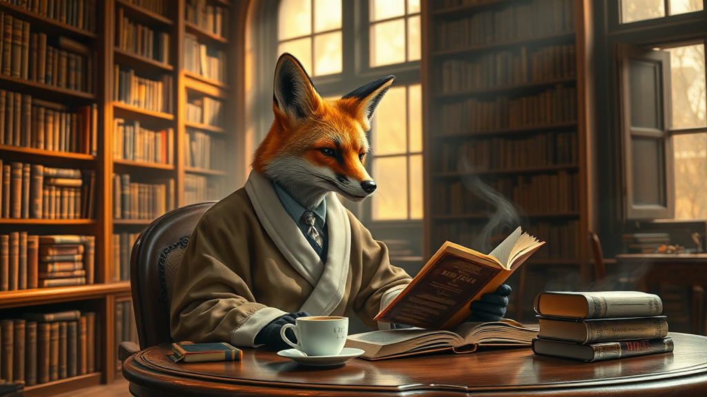 A sophisticated anthropomorphic fox sitting at a table engrossed in a classic novel, depicted as a portrait, donned in an elegant robe with a steaming cup of morning coffee beside it, surrounded by towering shelves filled with timeless books in a quaint library setting, the golden light of late morning filtering through dusty windows, creating an atmospheric and cinematic ambience for this realistic depiction.