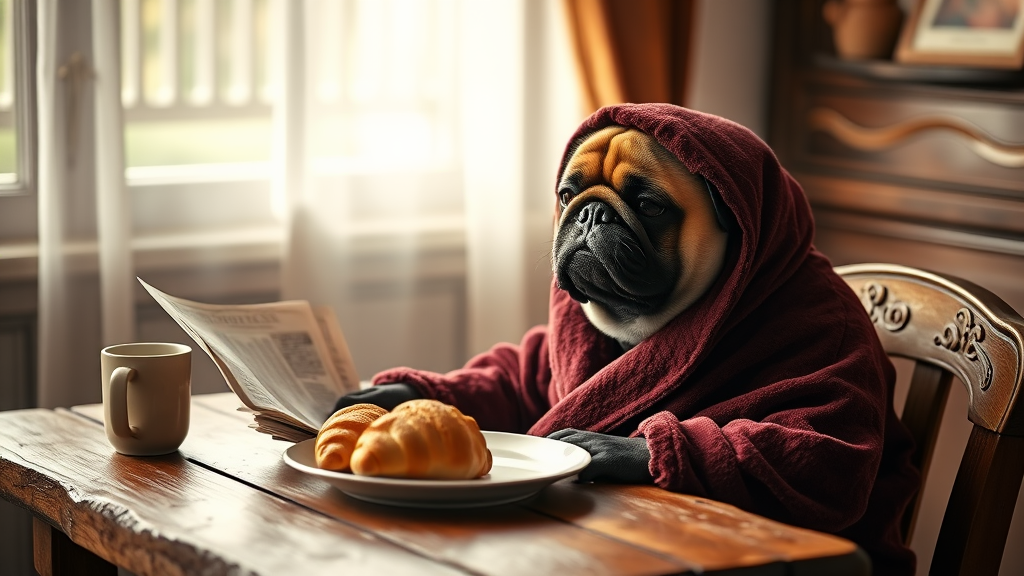 A sophisticated anthropomorphic pug dog seated at a rustic wooden breakfast table, wrapped in a plush, burgundy robe, leisurely enjoying a plate of croissants while intently reading a newspaper. The ambient lighting in the room creates a serene atmosphere, casting soft, soothing tones that enhance the detailed textures of the pug's fur and the intricate patterns of the robe. The scene is captured in cinematic HDR quality, with raw, intricately detailed visuals that highlight the warmth of the low contrast setting, offering a tranquil and refined morning moment.