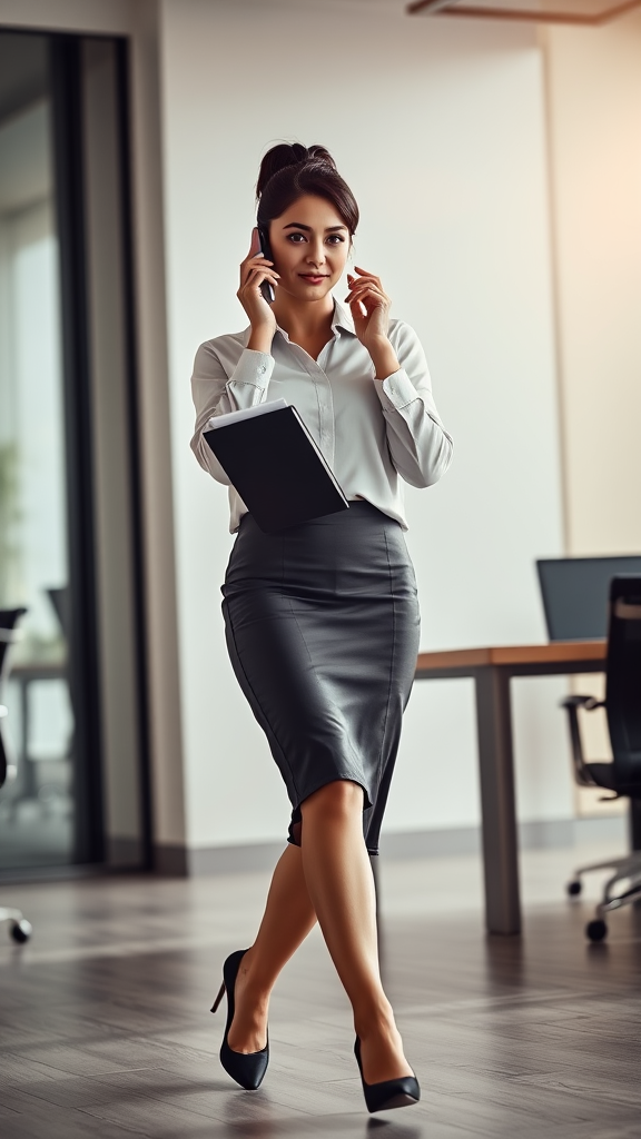 A sophisticated brunette woman with short hair styled in a ponytail stands gracefully in a contemporary office setting. She is confidently answering the phone while elegantly attired in a chic skirt and blouse ensemble, clutching a stack of sleek notebooks. The scene captures her in motion, striding purposefully towards the camera in a low angle shot. The composition is a masterpiece of refined elegance, shot in diffused broad light with a slight backlighting creating a halo effect. The bloom effect adds a gentle glow, accented with subtle light sparkles and chromatic aberration for an artistic touch. Her dynamic pose exudes professionalism and poise, the depth of field enhancing the sharp focus on her expressive, detailed eyes. The image is smooth and meticulously detailed, capturing the essence of modern elegance and confidence.