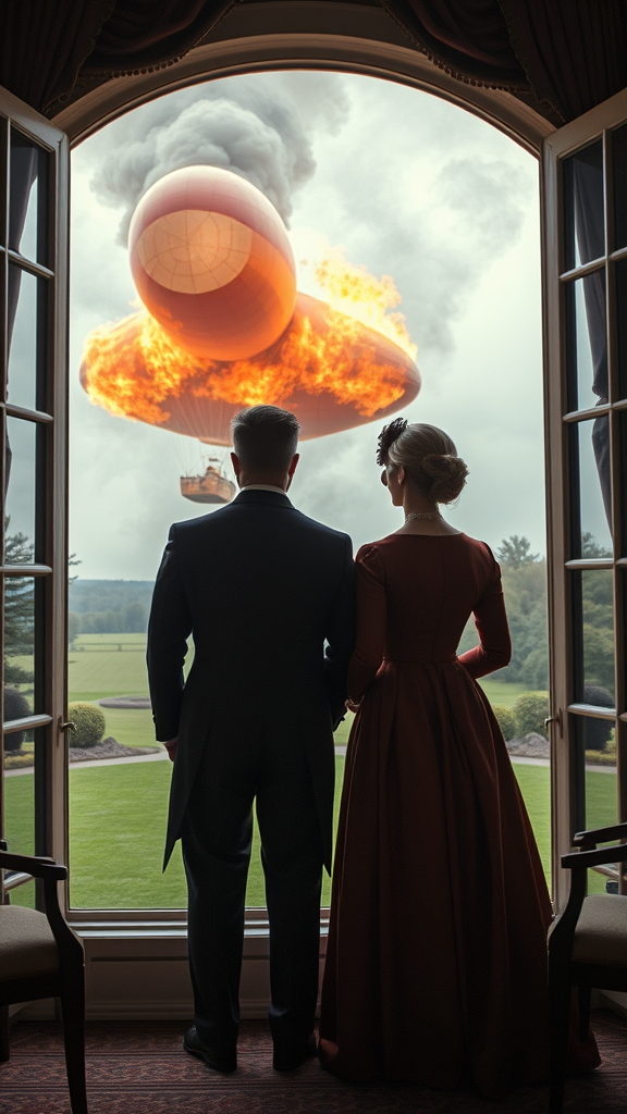 A sophisticated couple, adorned in the finest 1800s attire, stands poised and dignified beside their grand window, surveying their expansive estate. Their expressions, calm and assured, remain unchanged as they witness a dramatic event unfolding: a towering hot air dirigible, consumed by roaring flames, descends onto their manicured lawn with a resounding crash. Yet, the couple holds their ground with elegance and poise, embodying unshakeable fortitude in the midst of turmoil. The striking contrast between their noble composure and the chaotic inferno beyond creates an enthralling tableau that captivates the imagination and leaves a memorable impression. The exquisite details of their garments and the period decor of the room add layers of depth and opulence to the scene, while the fierce blaze and billowing smoke inject a sense of urgency and peril. The result is a breathtaking blend of historical grandeur and dynamic action, celebrating the enduring resilience of the human spirit in times of crisis.
