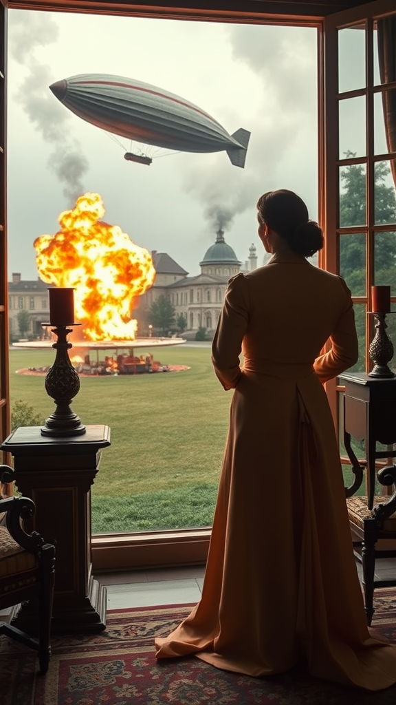 A sophisticated couple, donned in the luxurious attire of the late 1800s, stands with poise by the grand windows of their opulent estate. Their expressions remain calm and assured as they observe a dramatic calamity unfolding: a flaming hot air dirigible plummets onto their manicured lawn, erupting in a fierce explosion. The couple's unwavering presence amidst the chaos illustrates their formidable strength and elegance, highlighting the stark contrast between their composed demeanor and the fiery havoc outside. The intricate details of their garments and the lavish vintage decor of the room enrich the scene, while the fierce flames and billowing smoke evoke urgency and peril. The scene crafts a striking fusion of historical sophistication and dynamic action, celebrating the resilient human spirit in the face of disaster.