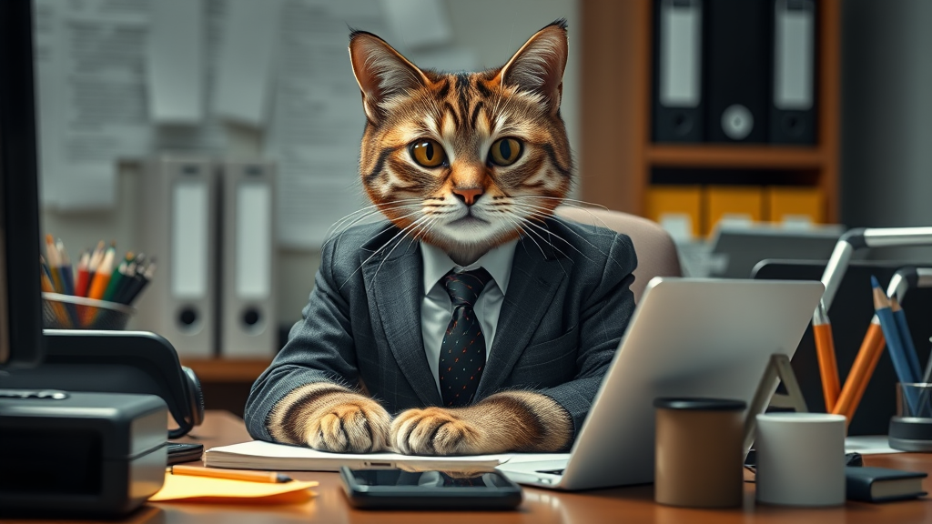 A sophisticated feline dressed in business attire diligently working at an office desk, engrossed in tasks, surrounded by modern office supplies, photorealistic, stunning details, masterpiece quality, ultra-high resolution, dimension 2:3, with a hint of playful curiosity in its eyes, exuding professionalism with a touch of whimsy.