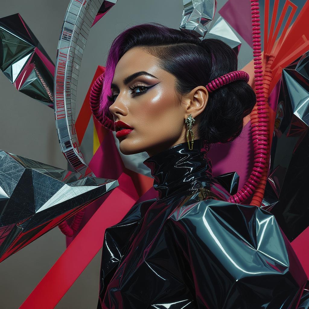 A sophisticated female model gazes diagonally, adorned in avant-garde clothing featuring sleek plastic and latex elements with futuristic flair, surrounded by abstract geometric patterns and asymmetric techno adornments. Captured in high-definition, medium shot with cinematic quality, inspired by Iris van Herpen's innovative style, the scene showcases an interplay of bold textures and surreal forms against a striking backdrop.