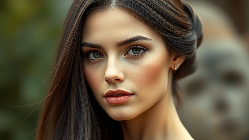 A sophisticated long-haired woman with her hair styled in a sleek bun, set against a natural backdrop. The portrait features an elegant headshot that exudes beauty and refined minimalism, reminiscent of high-end fashion editorials seen in Vogue. Her makeup is subtle yet chic, perfectly complementing her symmetrical facial features rendered with hyperrealistic detail akin to 3D models designed in Maya. The image captures a single, striking face with high-resolution textures in 4k, embodying a sense of intricate, timeless elegance.