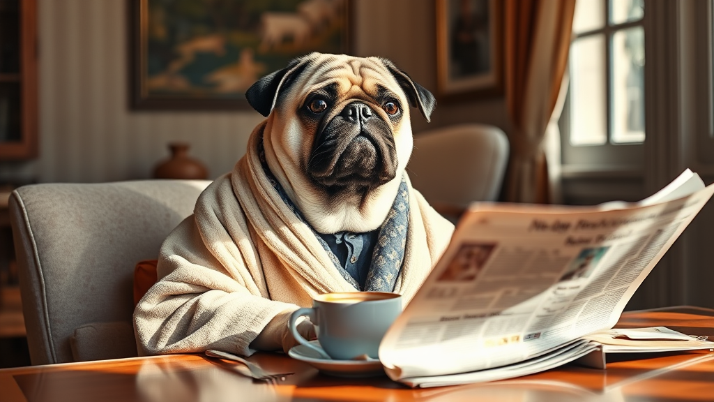 A sophisticated pug dog, dressed in a luxurious robe, leisurely enjoying breakfast while perusing the morning newspaper, set in a cozy lightroom environment with cinematic flair. The scene is captured in HDR, displaying intricate, high-quality details with soothing tones and a low contrast to create a serene atmosphere. The pug's expressive eyes and gentle mannerisms add a touch of whimsy to the scene, with sunlight casting a soft glow across the table, highlighting the rich textures of the setting.