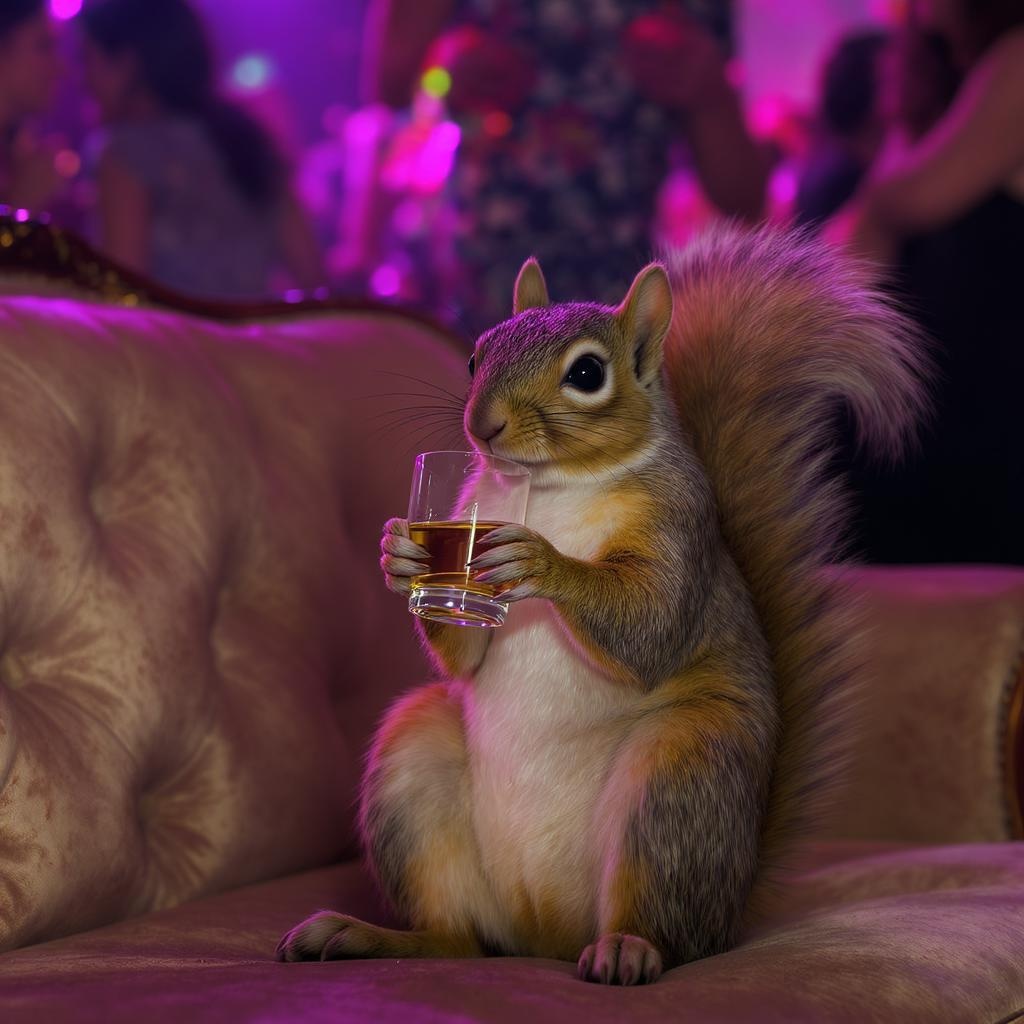 A sophisticated squirrel at a vibrant party, savoring a glass of whisky, comfortably perched on an elegant sofa, captured in photorealistic hyperrealism with intricate design and details, in 8k resolution, showcasing the rich textures of its fur and the delicate glass in its paw, set in a lively atmosphere with subtle ambient lighting in a 16:9 aspect ratio.