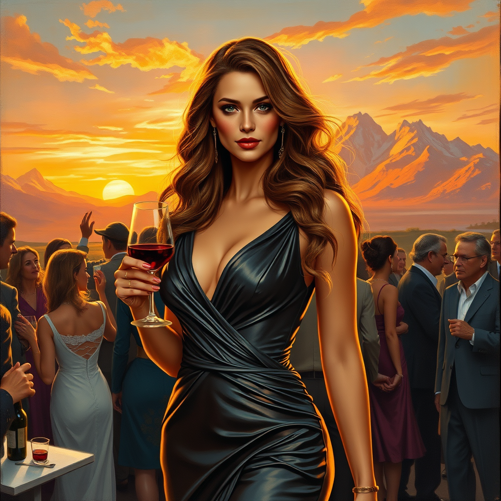 A sophisticated woman adorned in a stunning French-style dress, her long, wavy hair cascading gracefully down her shoulders, elegantly holds a glass of wine. The setting evokes a sense of opulence and grandeur, as she stands amidst a gathering of high society figures in the background. The scene is captured in hyper-realistic, high-resolution detail, reminiscent of an exquisite oil painting. The ambiance reflects the artistic essence of Frank Frazetta's brushwork, while majestic mountains reminiscent of Albert Bierstadt's work rise in the distance. A warm, golden sunset casts its glow over the landscape, adding an air of timeless beauty to the composition.
