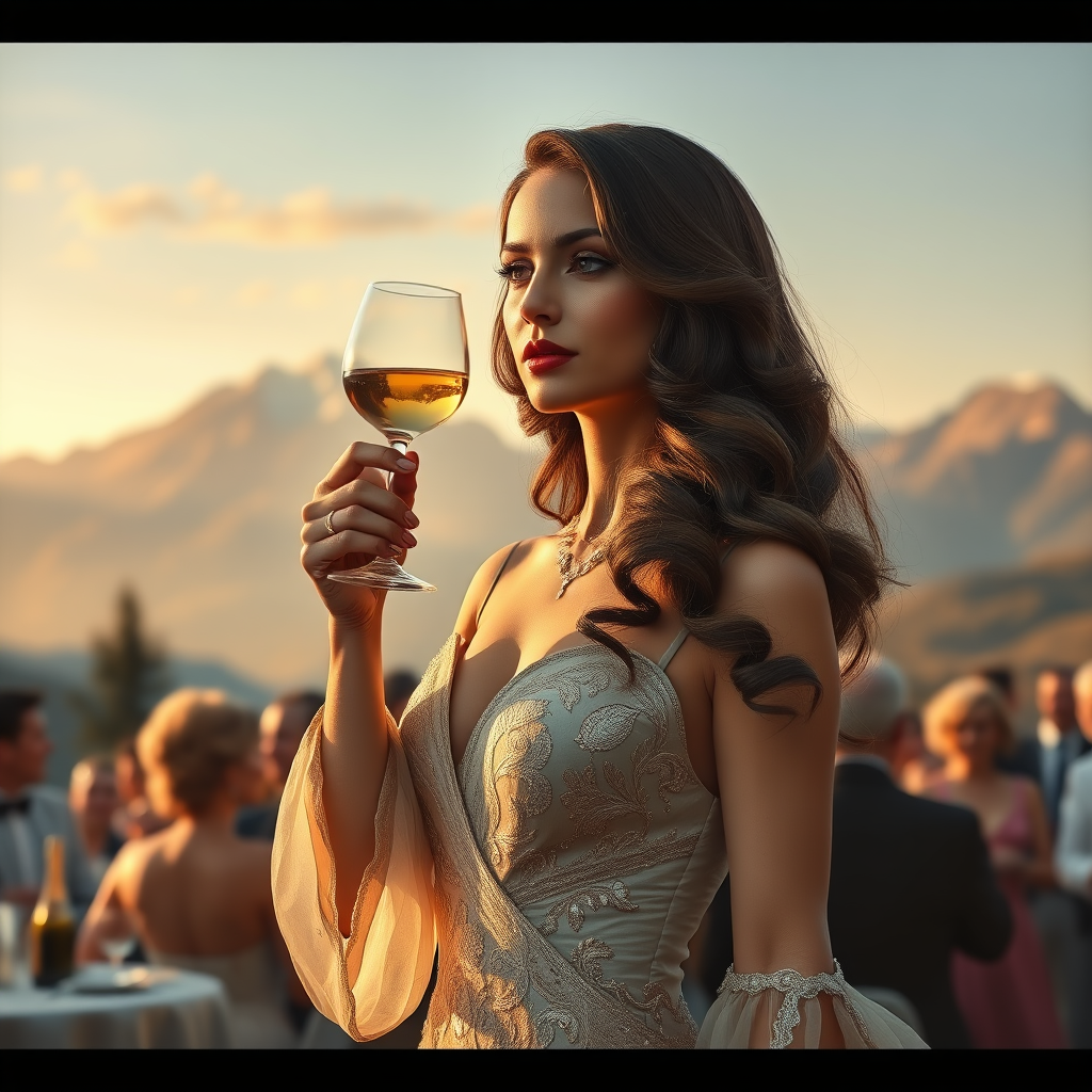 A sophisticated woman of high society, adorned in an exquisite French-style dress that shimmers with elegance, her long wavy hair cascading gracefully over her shoulders. She delicately raises a glass of wine to her lips, embodying poise and refinement. In the softly blurred background, a gathering of people adds a sense of lively companionship. The scene is captured with breathtaking hyper-realism, reminiscent of an oil painting by Frank Frazetta, where each brushstroke brings out the vibrancy and depth of her surroundings. The majestic mountains, reminiscent of Albert Bierstadt's grand depictions, loom in the distance, their peaks brushed with the warm hues of a setting sun that casts a golden glow over the landscape, enhancing the opulent atmosphere.