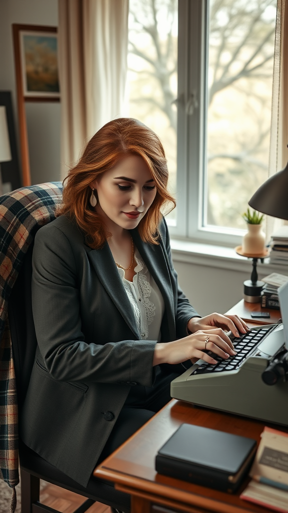 A sophisticated woman sits at a cluttered desk, typing away on a vintage typewriter, wearing a tailored office jacket with a hint of peasant jacket undertones, paired with a crisp white blouse and a few wisps of lace visible beneath an opened tartan-patterned bomber jacket draped over the back of her chair, intricate details on her facial features and hands, as the soft glow of a spring morning sunbeam cast through a stately tree and the partial window, the calculated graduation of hues from delicate pastel shades to warm morning wood tones that lights up her alabaster skin with an androgynous charm, and the richness of her dark auburn hair, catching subtlety defined wisps, a skinny gold chain necklace loosely loops, and the muted sickle-like suggestive slender yet unassuming thickness of her wispy and elaborate lip – side bou path underscore stature aesthetics applied.”