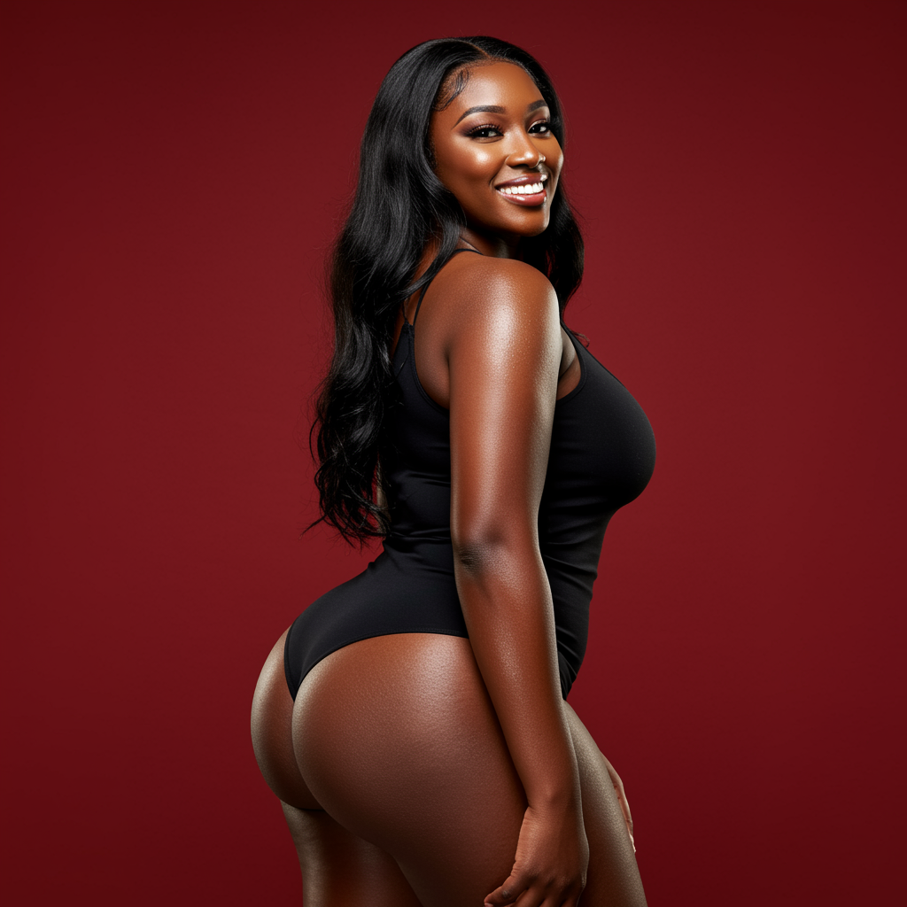 A sophisticated woman with a graceful aura stands confidently, her figure beautifully accentuated by her wide hips. Her black hair cascades down elegantly, framing her smiling face. Her skin is radiant and dewy, possessing a lustrous sheen that catches the light. Her poise and presence exude elegance and charm, embodying both confidence and allure.