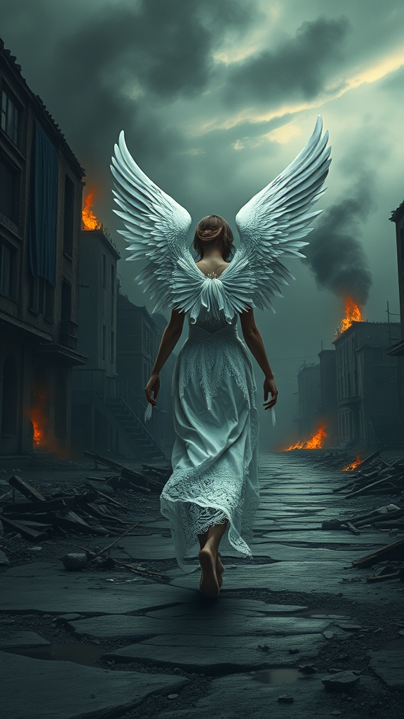 A sorrowful female angel with large white wings folded gracefully behind her walks along a crumbling street amidst the ruins, her intricate white dress flowing delicately with each step. The backdrop is a haunting scene of destroyed buildings under a darkened sky, where active fires crackle and rise. Volumetric fog weaves through the landscape, casting an eerie glow. The remnants of war lie scattered, with smoke curling upwards, painting a picture of despair. The entire scene is infused with an artistic, dreamy quality, reminiscent of a surreal illustration, capturing the ethereal yet haunting essence of this post-apocalyptic world.