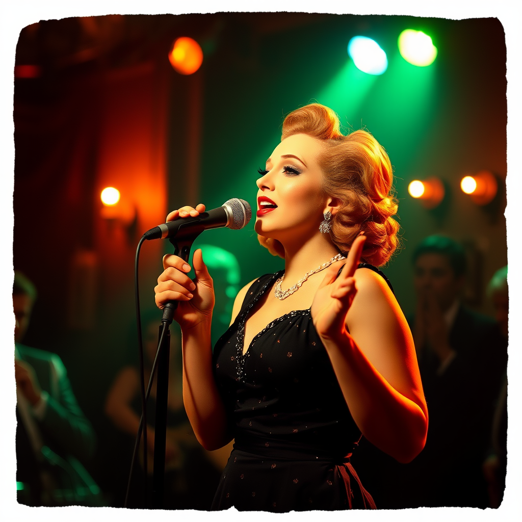 A soulful jazz singer from the 1940s, elegantly adorned in a classic speakeasy ensemble, captivating the audience with her melodious performance under the warm glow of retro spotlights.