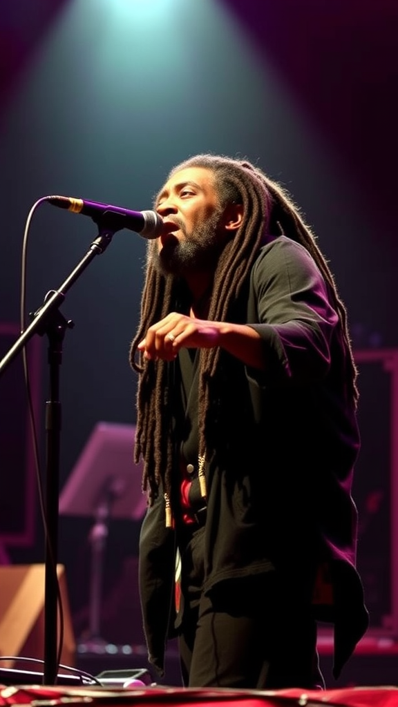 A soulful reggae icon spreading messages of peace and unity through vibrant melodies and heartfelt lyrics, inspiring generations with his charismatic presence and unwavering passion for social justice.