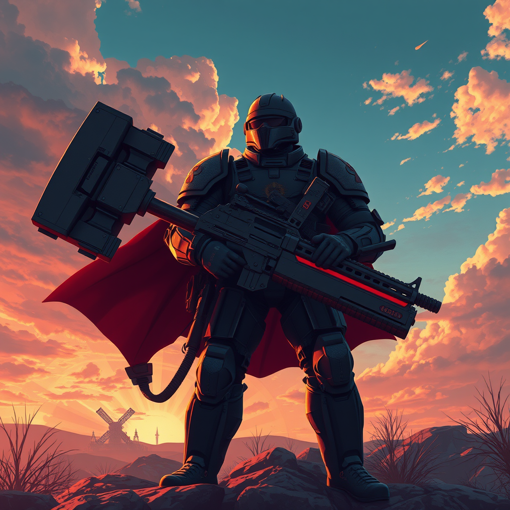 A Soviet soldier of the future clad in a sci-fi suit stands poised, wielding a colossal warhammer alongside a massive futuristic gun. The scene captures an anime and manga-inspired aesthetic, featuring bold, dark colors reminiscent of classic USSR posters. The artwork is intricately detailed with a high-definition, offset printing style, bathed in natural lighting that highlights the silhouette of the soldier against a dramatic sky. The overall composition is rendered in stunning 8K resolution, blending the nostalgic tones of Soviet-era imagery with a futuristic twist.
