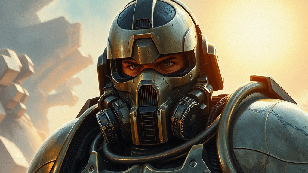 A space marine portrait set under the bright midday sun, with H. R. Giger's biomechanical intricacies intertwined into the armor, depicted as a detailed oil painting reminiscent of Rembrandt's masterful use of light and shadow, capturing the contrast between the hard metallic surfaces and the soft human features, adding subtle hints of surrealism with ethereal, otherworldly textures that blend seamlessly into the background while maintaining the focus on the marine's commanding presence.