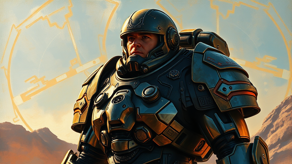 A space marine standing tall in broad daylight, intricate armor design echoing the biomechanical elegance of H. R. Giger, rendered with the rich textures and dramatic chiaroscuro of an oil painting reminiscent of Rembrandt, vibrant celestial hues reflecting off brilliant metallic surfaces, expression intense and contemplative, cosmic landscape subtly hinted in the background, capturing a harmonious blend of futuristic sophistication and classical artistry.